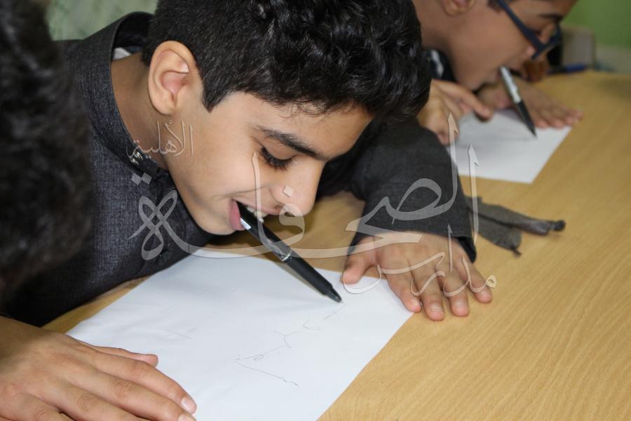 قامت أسرة اللغة العربية بالقسم الابتدائي (الصفوف العلوية) بإجراء مسابقة بين طلاب الصفوف (الرابع والخامس والسادس) في مهارة الكتابة بالفم، وذلك في جو من المتعة والمنافسة بين الطلاب لإظهار مهاراتهم وقدراتهم على التحكم بالقلم من خلال الفم.